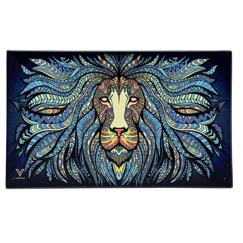 Bandeja para liar de vidrio templado grande. Modelo "Tribal Lion" de VSyndicate. Dimensiones: 26 cm x 18 cm. Peso: 600 gramos. Resistente y fácil de limpiar. Ideal para uso personal o como regalo sofisticado.