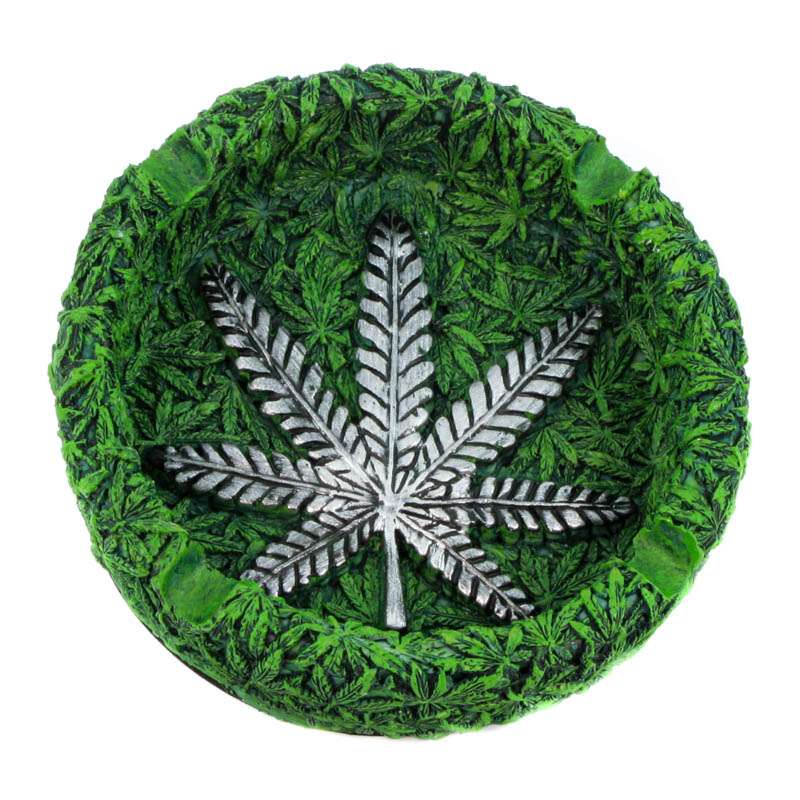 Material: Resina de alta calidad Color: Verde con detalles en relieve Dimensiones: 13 cm de diámetro y 3 cm de altura Diseño: Hojas de cannabis en relieve y hoja central de color plata