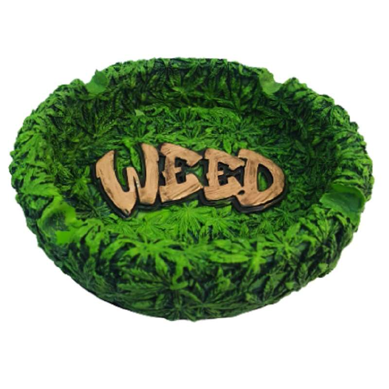 Material: Resina de alta calidad Color: Verde con detalles en relieve Dimensiones: 13 cm de diámetro y 3 cm de altura Diseño: Hojas de cannabis en relieve y palabra Weed central de color dorado