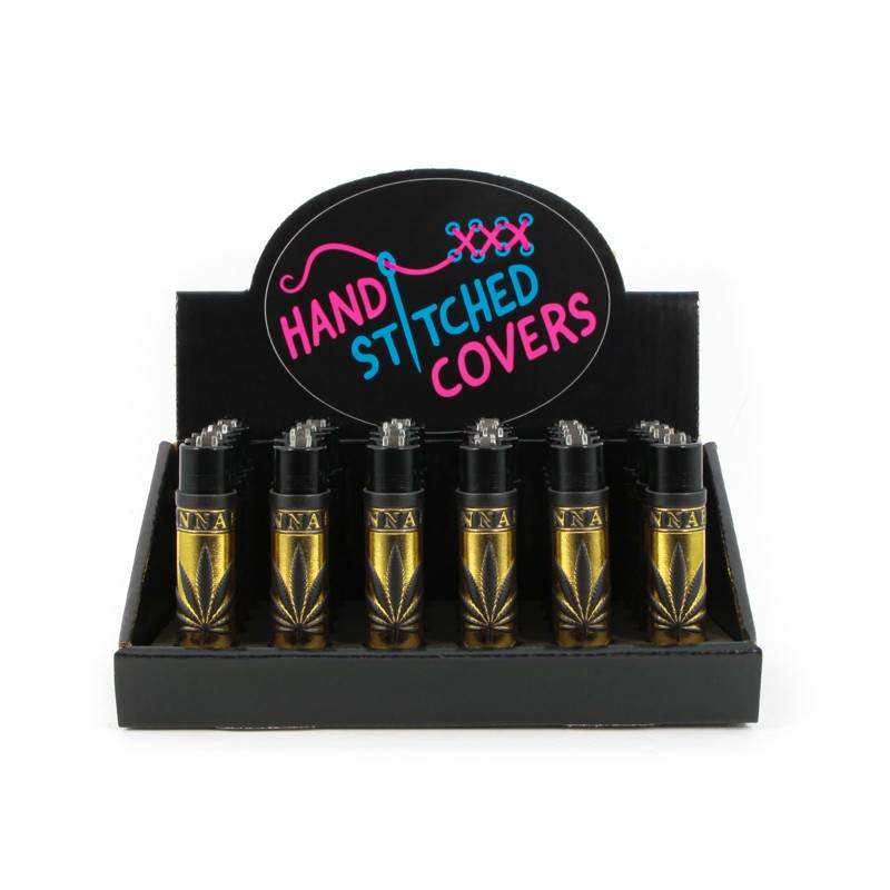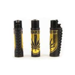 Clipper con funda de cuero "Hand stitched covers" con diseño hoja de cannabis sobre fondo dorado