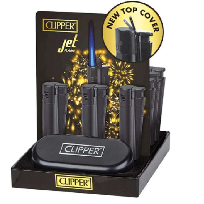 Caja de 12 mecheros Clipper de metal Jet Torch negro mate con estuche. Potente llama ajustable para tus necesidades. Calidad y estilo en cada encendido.