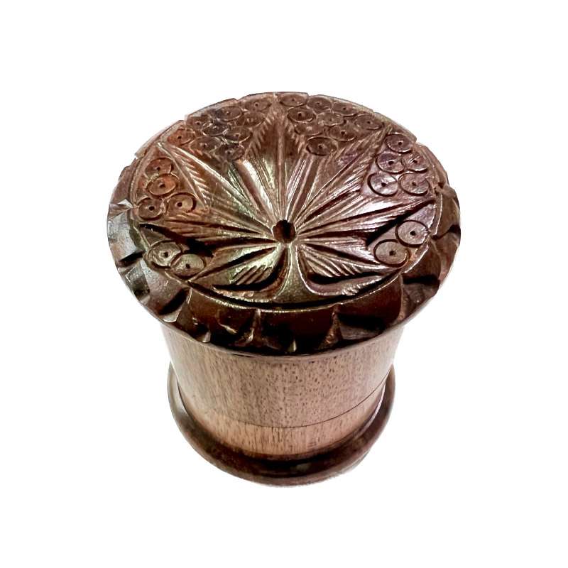 Grinder de madera con interior de aluminio y con diseño en la tapa de cannabis.