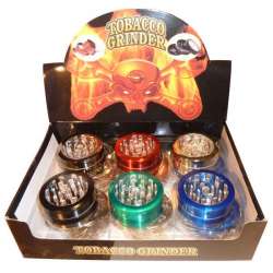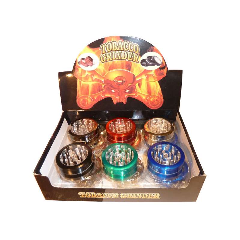 Grinder de metal con tapa metalica y de plastico Polinizador y espatula para recoger facilmente todo el producto grindado. Varios colores. El display completo consta de 12 piezas. El display completo tiene un 10% de descuento.