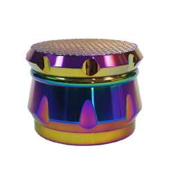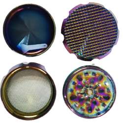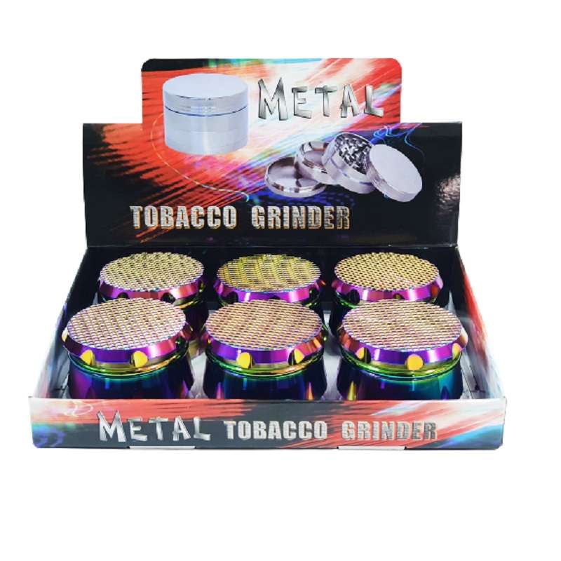 Caja de 6 grinders de metal de alta calidad en color arco-iris con diseño de cuadrados en relieve en la tapa. Cada grinder mide 60mm de diámetro y 44mm de alto, con 4 partes, polinizador y espátula. Además, cuenta con muescas en los laterales para facilitar el triturado.