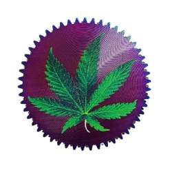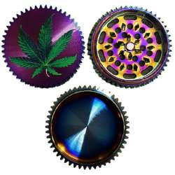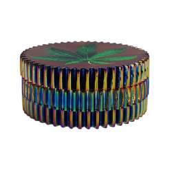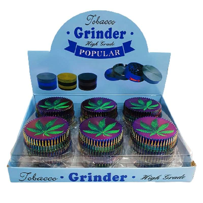 Caja de 12 grinders Ice Blue de metal de 54mm de diámetro y 24mm de altura. Con bordes dentados para un mejor agarre, polinizador y diseño de hoja de Cannabis. Perfectos para triturar hierba mientras estás fuera de casa o para regalar a amigos y familiares.