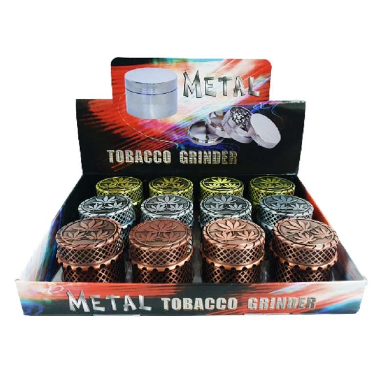 Caja de 12 grinders de metal con diseño de hojas de cannabis en relieve y acoplamiento magnético. Cada grinder tiene un diámetro de 45 mm y una altura de 44 mm, con 4 partes y polinizador con espátula incluidos. Disponible en 3 colores: plata, bronce y dorado.