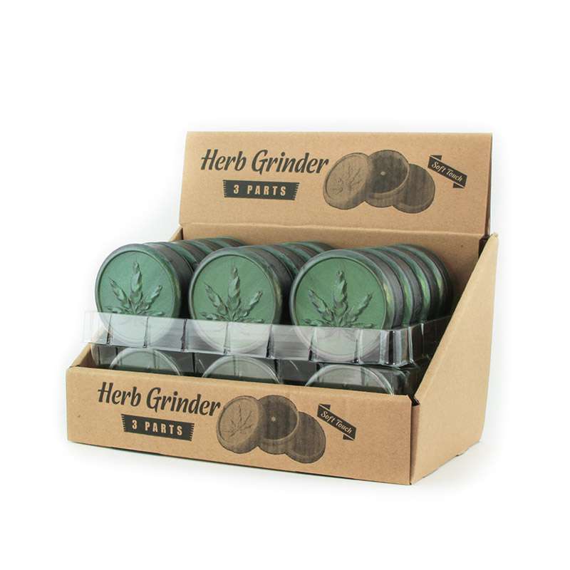 Características principales: Display con 24 unidades Grinders de plástico resistente Tamaño: 70 mm de diámetro Estructura de 3 partes: molienda y almacenamiento. Modelos en color: Verde metalizado Ligero, práctico y fácil de transportar Ideal para catálogos de distribución, venta en tiendas de parafernalia, estancos, grow shops o regalos