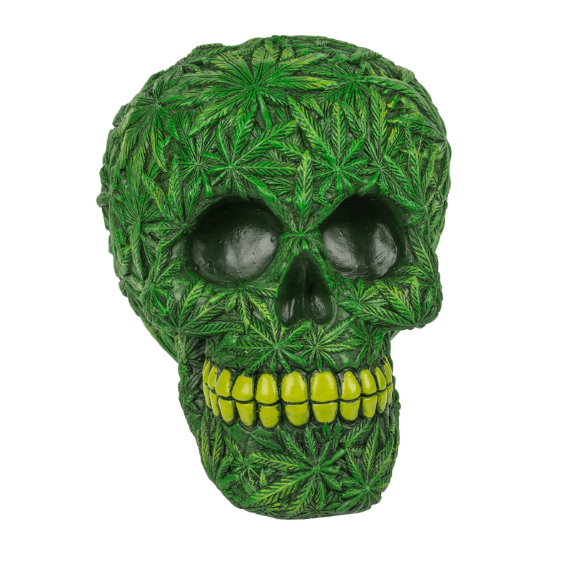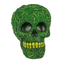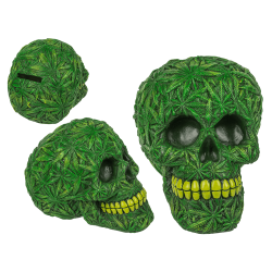 Hucha de resina con diseño de calavera y hojas de cannabis en relieve en color verde.