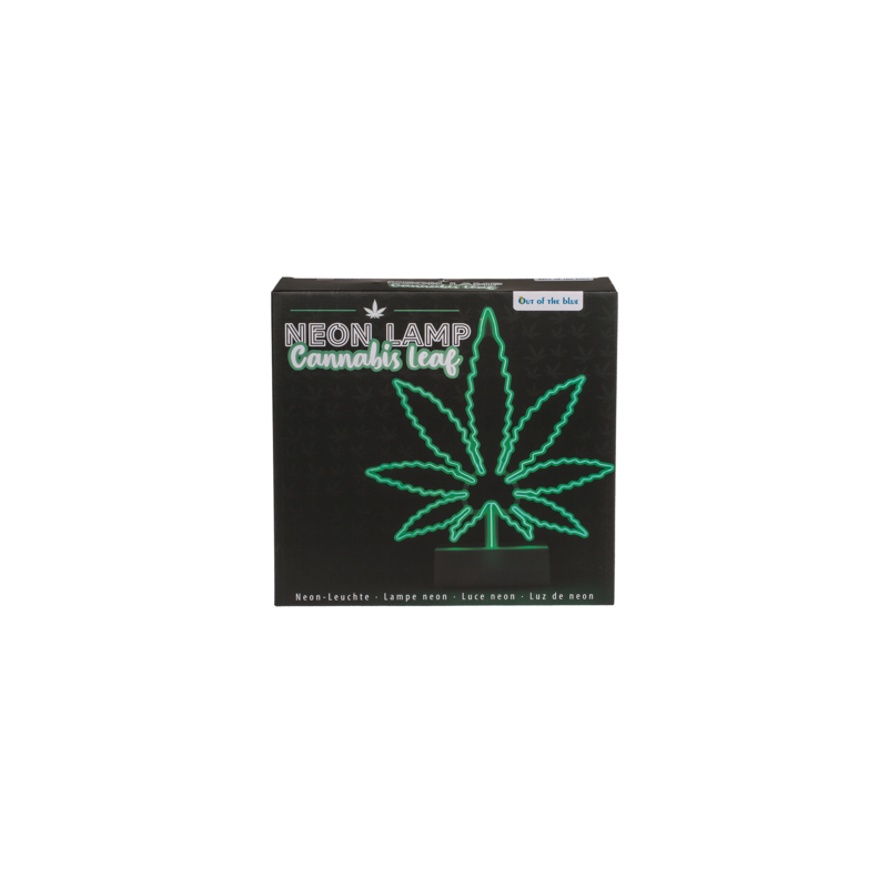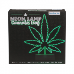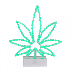 Lampara Neon de plástico con cable USB y diseño de hoja de cannabis. Contiene soporte para mesa y cable largo para colgar de la pared.