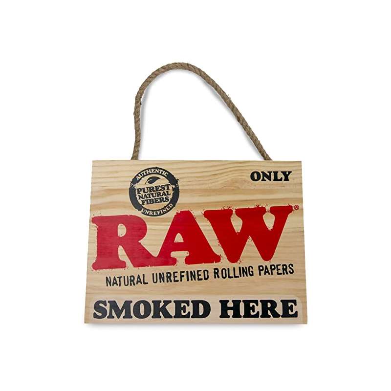 Cartel de madera con logotipo Raw y mensaje "smoked here". Medidas de 30,5cm x 23cm x 1cm para un impacto visual perfecto. Cordel incluido para colgarlo cómodamente.
