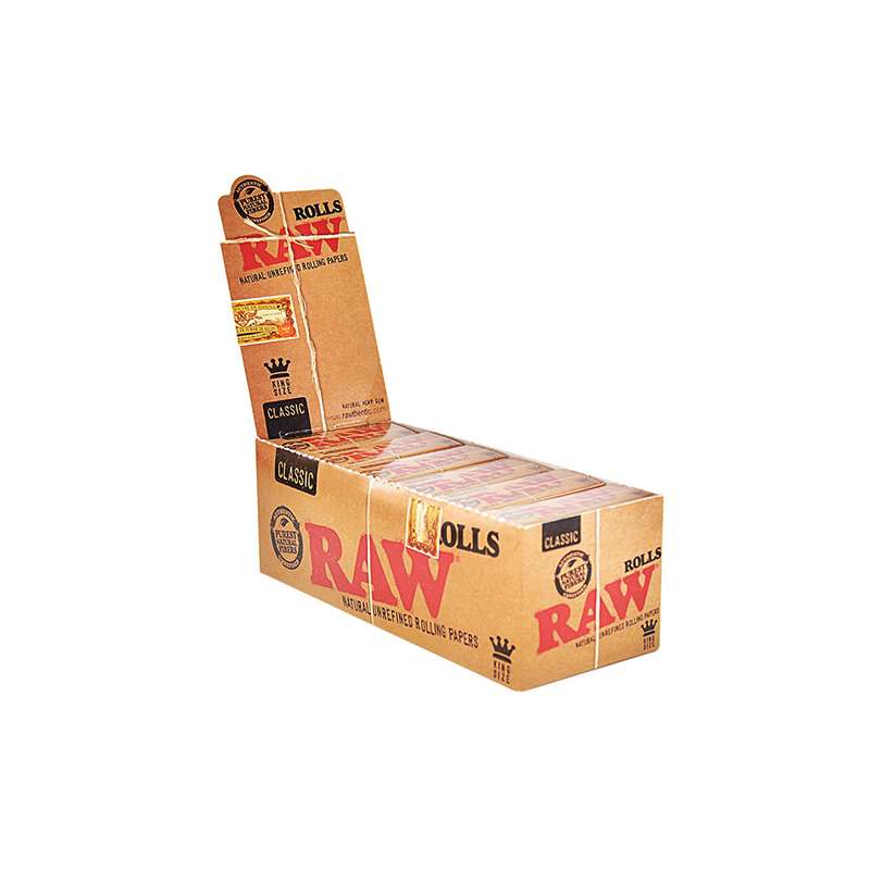 Raw Rollo King Size Classic - 3 mt. Cada rollo tiene una longitud de 3 metros y un ancho de 55mm, lo que te permite cortarlo a la medida deseada y disfrutar de cigarrillos más largos. Cada caja contiene 12 rollos de papel.