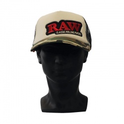 Diseño tipo trucker con frontal beige y visera camuflaje Logotipo Raw bordado en relieve Frase "A natural way to roll" en la parte frontal de la visera Malla trasera negra para mejor ventilación Cierre snapback ajustable Talla única unisex Ligera, resistente y cómoda Producto original de Raw