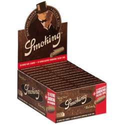 Descubre la caja de papel de liar Smoking Brown King Size y filtros de la reconocida marca Smoking. Esta caja contiene 24 librillos, cada uno con 33 hojas ultrafinas de 44mm de ancho y 33 filtros de cartón que proporcionan una experiencia incomparable. Fabricados con papel de la más alta calidad y diseñados para una combustión lenta y uniforme, estos papelillos permiten disfrutar al máximo del sabor y aroma de tu hierba favorita.