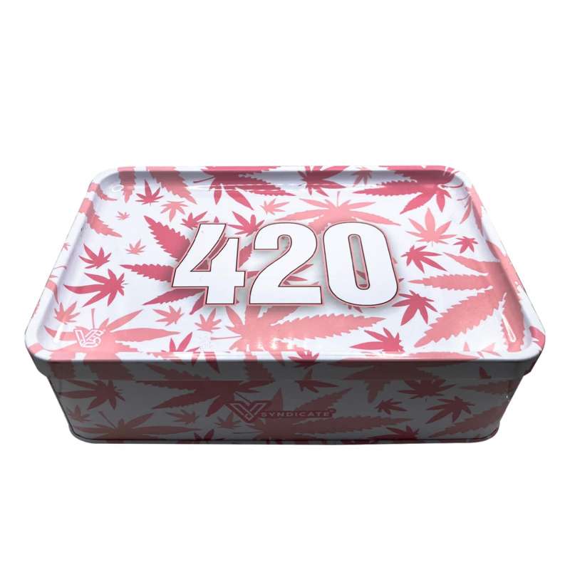 Caja de Metal Syndicase Plus con tapa de bandeja de liar de V-Syndicate. Diseño 420 Pink.