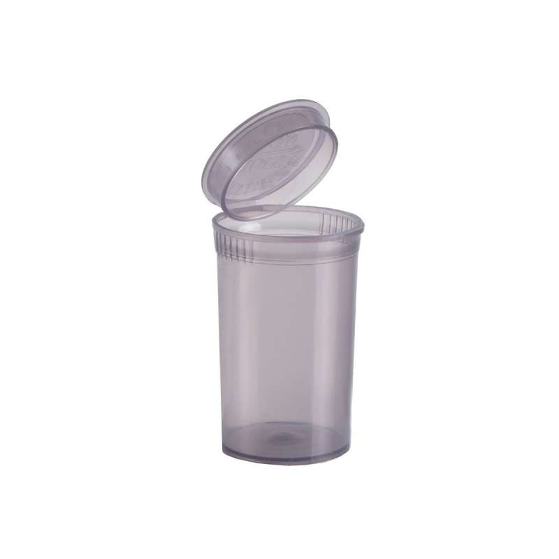 Récipient en plastique avec fermeture popup. De taille moyenne, idéal pour le cannabis. Couleur gris.