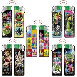 Boîte de 50 briquets électriques Pop Art Leaves Dora Lighters. Différents motifs pop art avec des feuilles de cannabis. Chaque briquet comporte 2 designs.