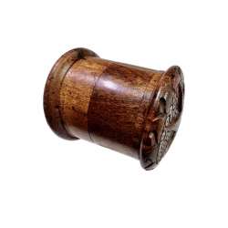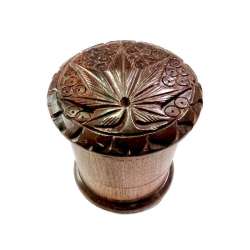 Grinder en bois avec intérieur en aluminium et motif cannabis sur le couvercle.