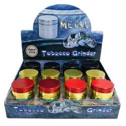 Boîte de 24 grinders métalliques de 28mm de diamètre et 20mm de hauteur. Polinisateur et trois designs différents : noir, doré et couleurs rasta. Parfaits pour les emmener partout avec vous ou offrir en cadeau.