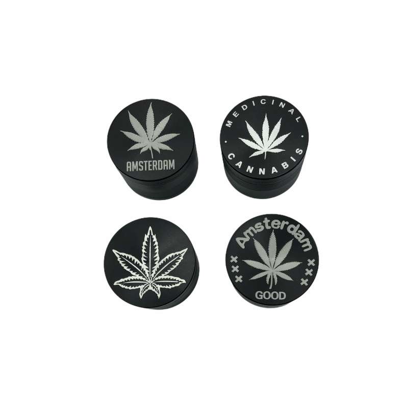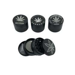 Grinder métallique noir avec des motifs de cannabis blanc. Affichage de 6 unités. 60mm de diamètre 42 mm de haut Il se compose de 4 parties Il a un pollinisateur et un grattoir pour enlever le contenu.