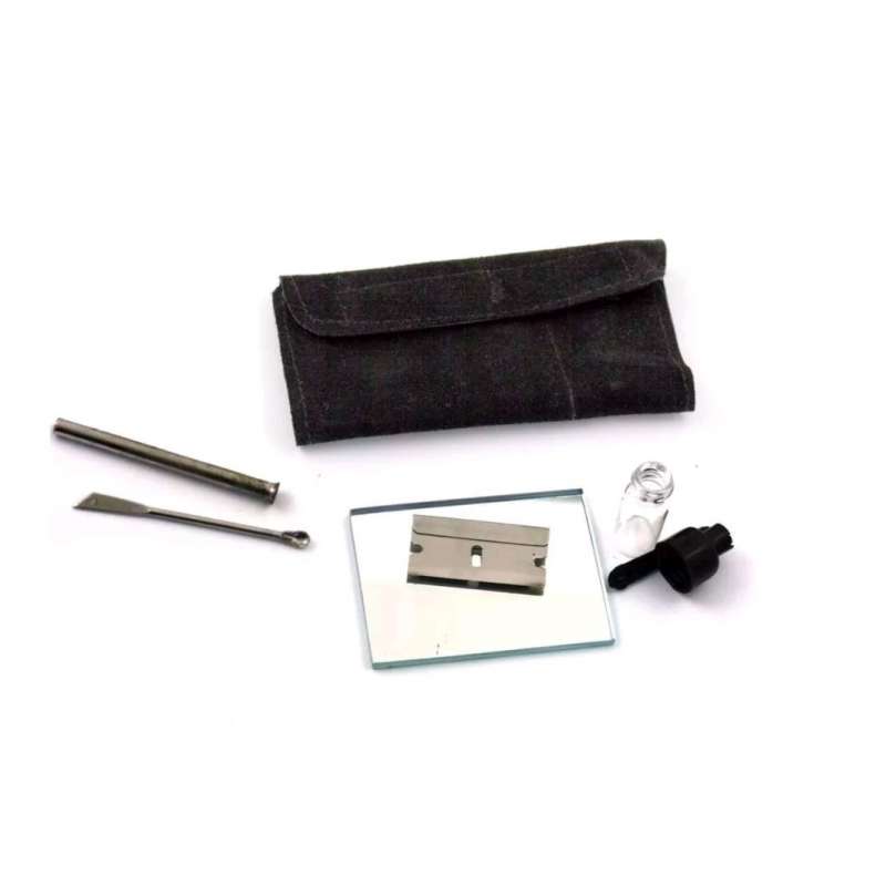 kit de reniflement avec housse en daim noir Contient plusieurs accessoires : - 1 x bouteille de base. - 1x miroir. - 1 x lame - 1 x petite cuillère - 1 x tube basique - 1 x tube large en aluminium