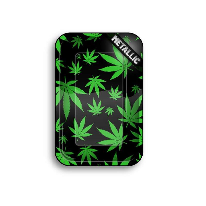 Plateau de roulage Fire-Flow V2 en métal Leaves Green. Dimensions de 27,5 cm x 17,5 cm. Sa surface plate et ses rebords surélevés évitent les renversements.