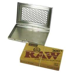 Raw Boîte Métal 300'S Grinder. Avec une capacité pour un paquet de Raw 300's 1 1/4 et un grinder de type grinder card intégré dans le couvercle. Double fonction : rangement des papiers et conteneur de broyage.
