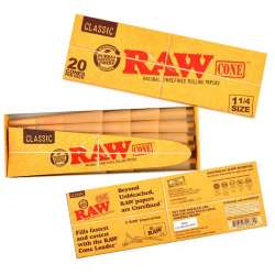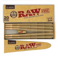 Cônes Raw Classic 1 1/4, prêts à remplir. Boîte de 20 cônes King Size avec embout. Taille du cône : 75x45mm. Découvrez la commodité et la saveur authentique des cônes Raw Classic.