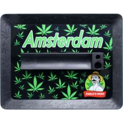 Rolling Tray en plastique noir Amsterdam Pablos Weed Feuilles. Profitez d'une expérience pratique et stylée avec ces plateaux en plastique. Ce plateau compact et léger est conçu pour ceux qui recherchent commodité et organisation lors de la préparation de leurs cigarettes, sans renoncer à la personnalité et au style des designs inspirés par la ville vibrante d'Amsterdam.