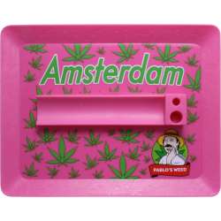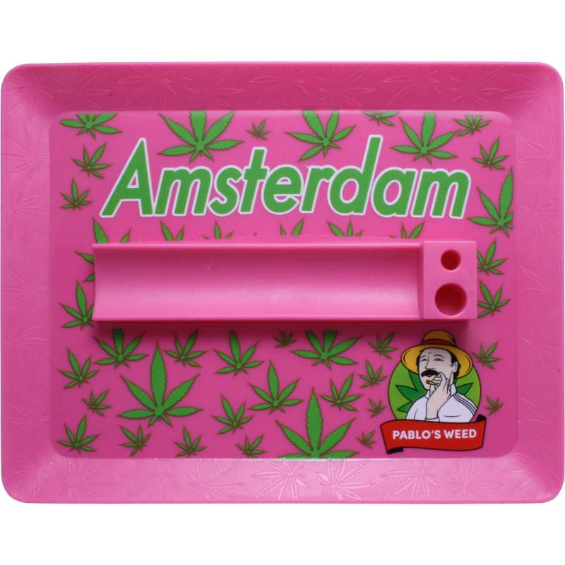 Rolling Tray en plastique rose Amsterdam Pablos Weed Feuilles. Profitez d'une expérience pratique et stylée avec ces plateaux en plastique. Ce plateau compact et léger est conçu pour ceux qui recherchent commodité et organisation lors de la préparation de leurs cigarettes, sans renoncer à la personnalité et au style des designs inspirés par la ville vibrante d'Amsterdam.