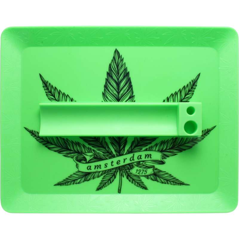 Rolling Tray en plastique vert Amsterdam Feuille. Profitez d'une expérience pratique et stylée avec ces plateaux en plastique. Ce plateau compact et léger est conçu pour ceux qui recherchent commodité et organisation lors de la préparation de leurs cigarettes, sans renoncer à la personnalité et au style des designs inspirés par la ville vibrante d'Amsterdam.
