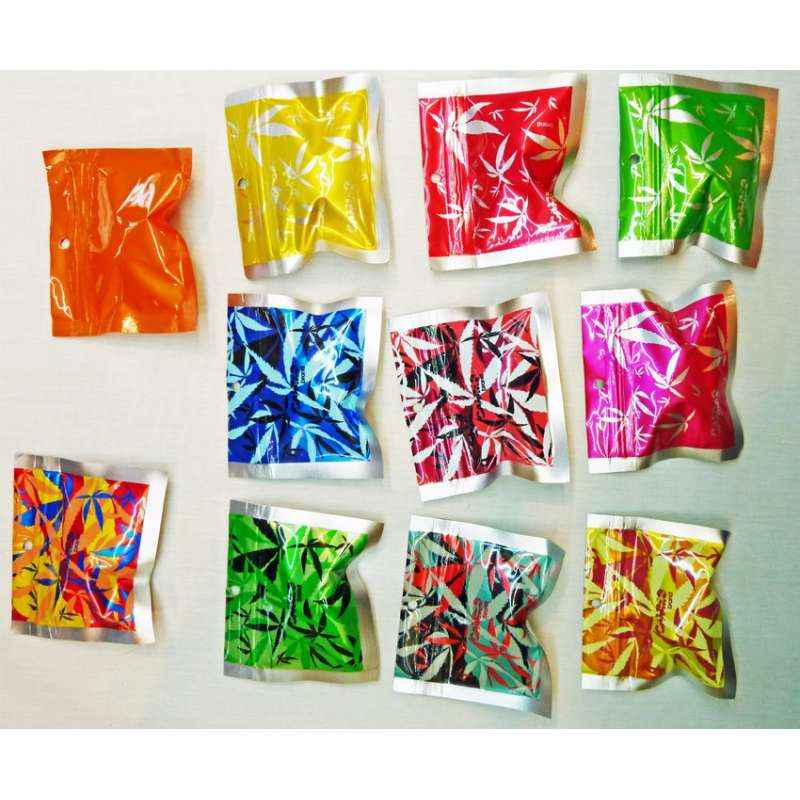 Sac en aluminium Zip Lock avec motif feuille de cannabis de différentes couleurs. Des sacs anti-couleur et résistants pour garder le produit toujours frais. Mesures: 9,5 cm x 8,5 cm