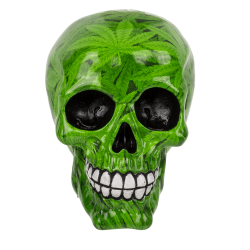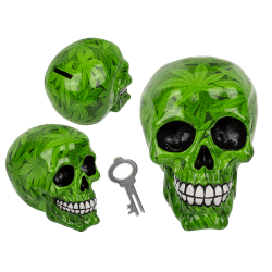 Tirelire en résine avec motif tête de mort et feuilles de cannabis vertes.