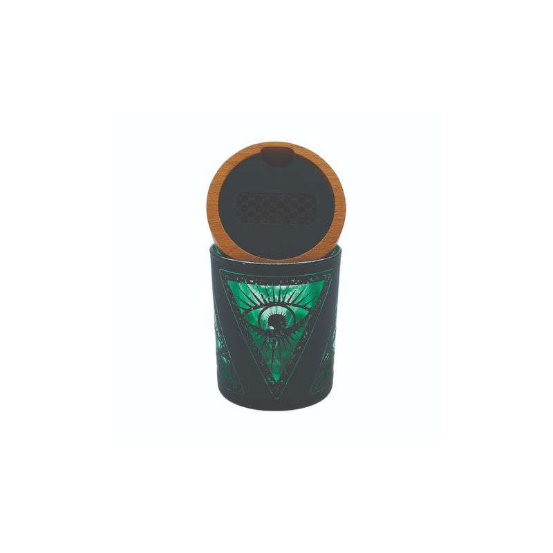 Le dessus du couvercle SmartStash comporte une carte de broyeur magnétique brevetée, qui vous permet de broyer les herbes directement dans le bac en bois.