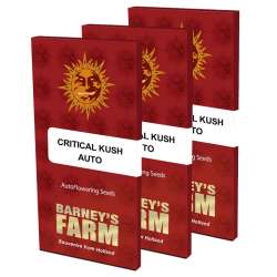 Embalagem com 3 sementes de Barney's Farm Critical Kush Auto. Critical Kush Auto, um cruzamento entre Critical Kush e BF Super Auto #1. Botões exquisitos e compactos com sabores terrosos de pinho e Kush.