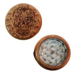 Caixa de 12 grinders de madeira com designs de caveiras mexicanas. Cada grinder é composto por 2 partes e tem dentes de metal. Perfeitos para distribuidores, comércio ou indivíduos. Diâmetro de 53mm e altura de 27mm.