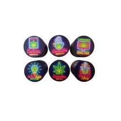 Uma caixa com 12 moedores de 4 partes com polinizador e espátula, com um diâmetro de 40 mm e uma altura de 37 mm, apresentando seis designs diferentes com tema de cannabis e luzes de neon em cores vibrantes. Cada moedor possui um design único para atender qualquer estilo pessoal, proporcionando uma experiência excepcional de moagem. Além disso, a ferramenta de espátula incluída ajudará a coletar o pólen para maior aproveitamento. Seja o centro das atenções em qualquer encontro com esses moedores chamativos e únicos. Clique em nossa página para descobrir mais sobre nossos produtos de qualidade. -12 moedores - 4 partes - Diâmetro de 40 mm