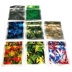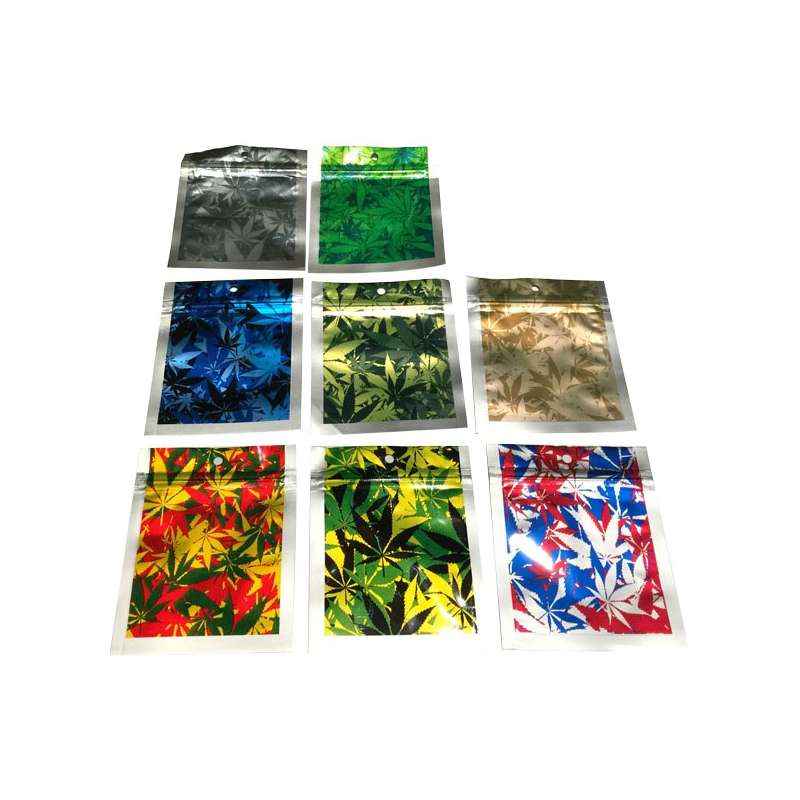 Bolsita Zip Lock aluminio con diseño de hojas de cannabis en diferentes colores. Antiolorl y resistentes bolsitas para mantener el producto siempre fresco.