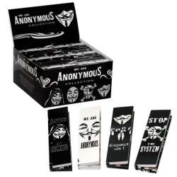 Conjunto de 26 livretos Tamanho King Snail Papel de Enrolar Anonymous. Cada livrinho contém 32 folhas e 32 filtros. Ultrafino e combustão lenta. Designs temáticos do Anonymous em quatro variedades. Goma-arábica para um fecho seguro. Embalagem cuidadosamente projetada.