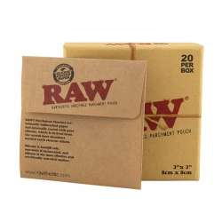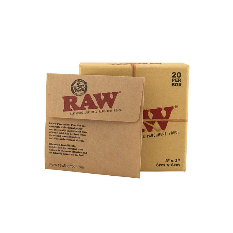 Caixa de Sobres Pergaminho Raw com 20 unidades. Envelopes lisos revestidos com silicone natural não refinado. Ideais para BHO, ceras e materiais pegajosos. Dimensões: 8 cm x 8 cm.